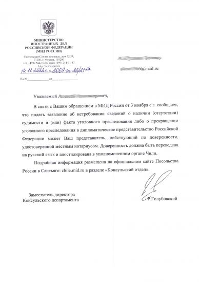 Ответ из консульского департамента МИД РФ о возможности использования доверенности, заверенной чилийским нотариусом. Ноябрь 2022 года.