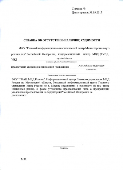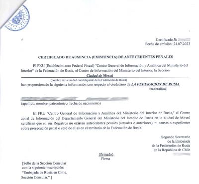 El FKU "Centro General de Información y Analítica del Ministerio del Interior de Rusia", el Centro zonal Información del Departamento General del Ministerio del Interior de Rusia en la ciudad de Moscú certifican que en sus Registros no existen antecedentes penales (actuales o anteriores), ni causas o expedientes sobre prosecución legal o cese de ellas en el territorio de la Federación de Rusia.
