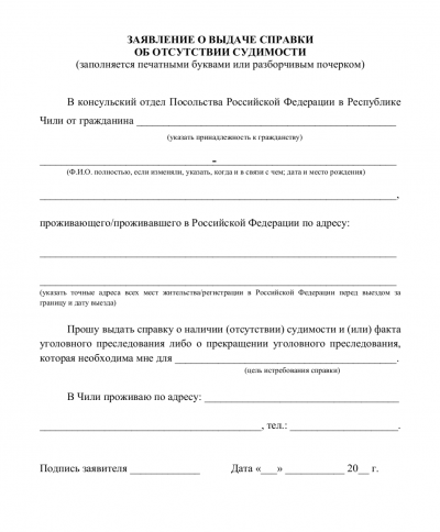 Для получения консульской справки о несудимости необходимо обратиться в Консульство РФ в Сантьяго с паспортом.