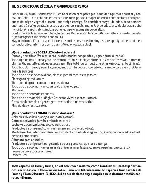 В Чили действуют очень жесткие правила ввоза любых товаров животного или растительного происхождения. В общем случае, если вы везете съестные припасы любого вида, корм для животных, лекарства и шампуни для животных, деревянные изделия, настоятельно рекомендуется пометить Sí/Yes в пункте IIIа. Это убережет от штрафов.
