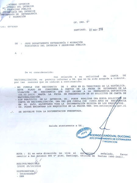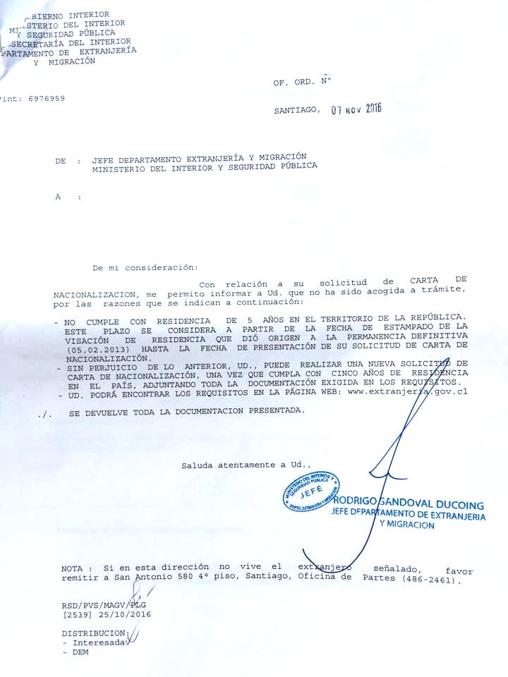 Отказ в предоставлении гражданства (эстранхерия Сантьяго, ноябрь 2016 года). Аргументация: срок в 5 лет отсчитывается от предоставления статуса Permanencia Definitiva.