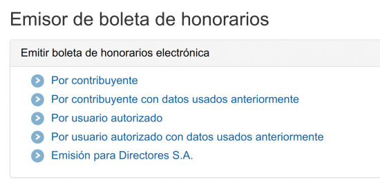 Необходимо авторизоваться на сайте Службы внутренних налогов (SII), далее выбрать в меню "Serivicios online" пункт "Boletas de honorarios electrónicas", щелкнуть по "Emisor de boleta de honorarios".