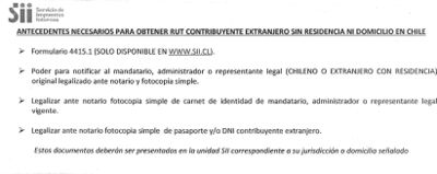 Список документов для получения RUT физическим лицом, не имеющим в Чили местожительства или вида на жительство. Получено в SII коммуны Сантьяго в апреле 2016 года.