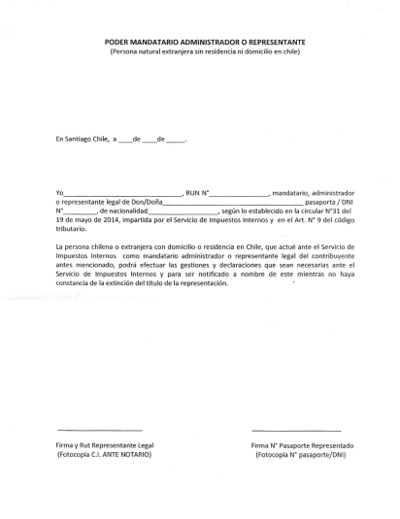 - Доверенность на уведомление поверенного, администратора или легального представителя (гражданина Чили или иностранца с видом на жительство) - оригинал, заверенный у нотариуса и простая ксерокопия. Форма такой доверенности выдается в отделениях SII. Она подписывается у нотариуса как налогоплательщиком, так и представителем.