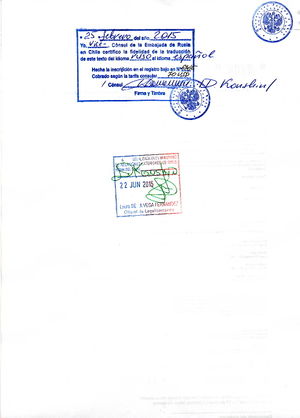 [Sello de la Sección Consular con la siguiente inscripción: "Embajada de Rusia en Chile, sección Consular."]