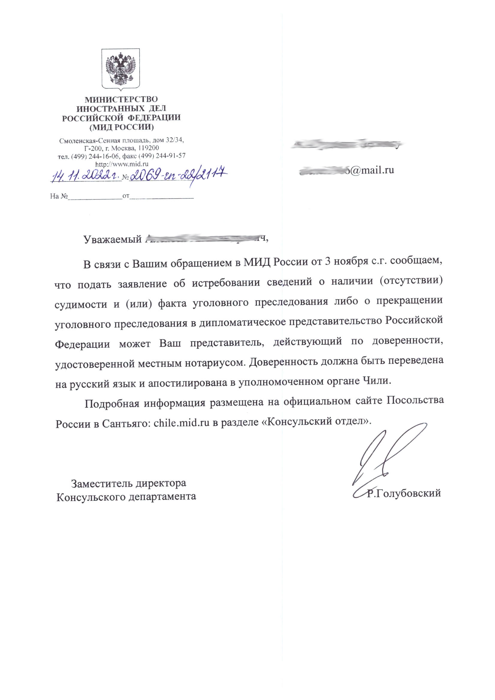 | 18:28, 8 декабря 2022 | Использование чилийской доверенности.jpg (файл) | 188 КБ | Ответ из консульского департамента МИД РФ о возможности использования доверенности, заверенной чилийским нотариусом. Ноябрь 2022 года. | 1 | |