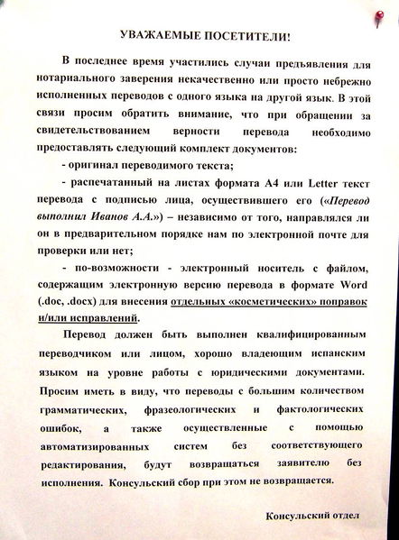 Объявление на стене консульства России в Сантьяго. Октябрь 2015 г.